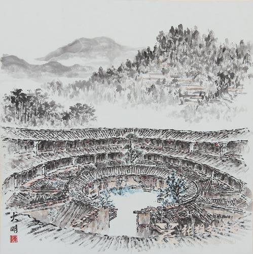 林语堂对他的家乡平和曾说过:“如果我有一些健全的观念和简朴的思想,那完全是得之于闽南坂仔之秀美的山陵。"陈火明先生1972年出生于福建平和。家乡平和不仅哺育了陈火明先生的生命,也滋养了他的创作灵感,唤醒了陈火明先生心中的虔诚与童真,激发了他的创作热情。陈火明先生的画作有一种朴实无雕的厚重感。他画的树仿佛随风摇曳,他画的村落、稻田仿佛是首不经意间吟唱的诗,深扎在青山黛色之中。这大概就是艺术家性情的本色,最合乎墨色的笔意。在《语堂故居》这幅画中,陈火明先生用大量的笔墨描绘了故居前的三四棵大树,它们苍古挺拔,枝繁叶茂、光影斑斑,大树即是生命,大树即为灵魂,它用自己的繁盛庇佑着人们。无论是走进故居里的、还是在故居外休憩的人,无不延续大树的希望。其作品《楼外》依旧用率性的笔墨,以“家乡人”独特的视觉娓娓道来。《雾起秀山》与其说陈火明先生在描绘晨雾弥漫下的山村,不如说是他在抒写山村的宁静。
